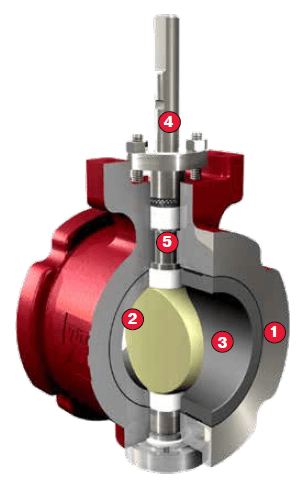 ❷ Керамический (PSZ Ceramic) или твёрдосплавный (Chrome Iron) диск имеет оптимальную гидродинамическую форму и смещен относительно штока. Такая конструкция позволяет избежать повышенного износа на кромках диска при малых углах открытия и, также достичь высокого значения коэффициента расхода Kv и снизить завихрения потока рабочей среды. Благодаря твердости применяемых материалов (до 2460 HV по Виккерсу) достигаются высокие показатели срока службы даже в самых тяжелых условиях.