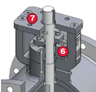 ❺ Уникальная система уплотнения штока с двумя комплектами уплотнений в корпусе и вкладыше. Такая конструкция предотвращает попадание рабочей среды в критические области, такие как зоны подшипников. Шток и подшипники обработаны специальным покрытием NEDOX, которое обеспечивает дополнительную герметичность и защиту от износа. Также предусмотрена возможность смазки подшипниковой зоны в процессе эксплуатации.