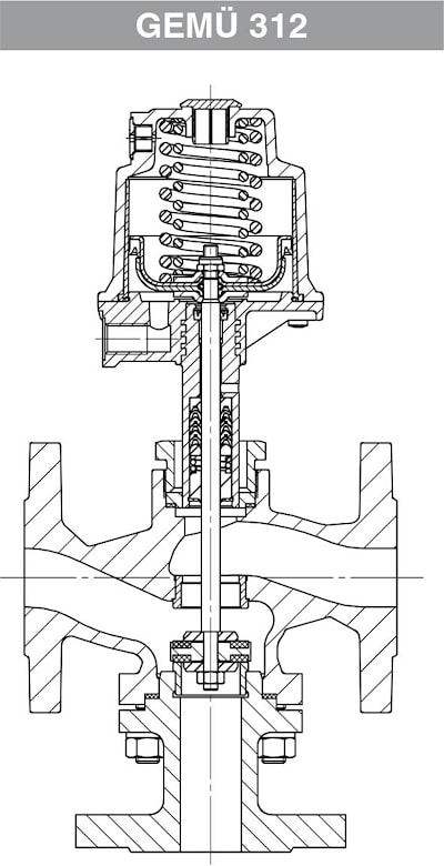 GEMÜ 312 имеет фланцевое крепление. Головка клапана с двусторонним уплотнением соединена шпинделем клапана с приводом. Уплотнение шпинделя клапана осуществляется само-уплотняющейся сальниковой набив-кой, благодаря чему обеспечивается не требующее обслуживания и надежное уплотнение шпинделя клапана на протяжении длительного срока эксплуатации. Съемное кольцо перед сальниковой набивкой дополнительно защищает ее от загрязнений и повреждений.