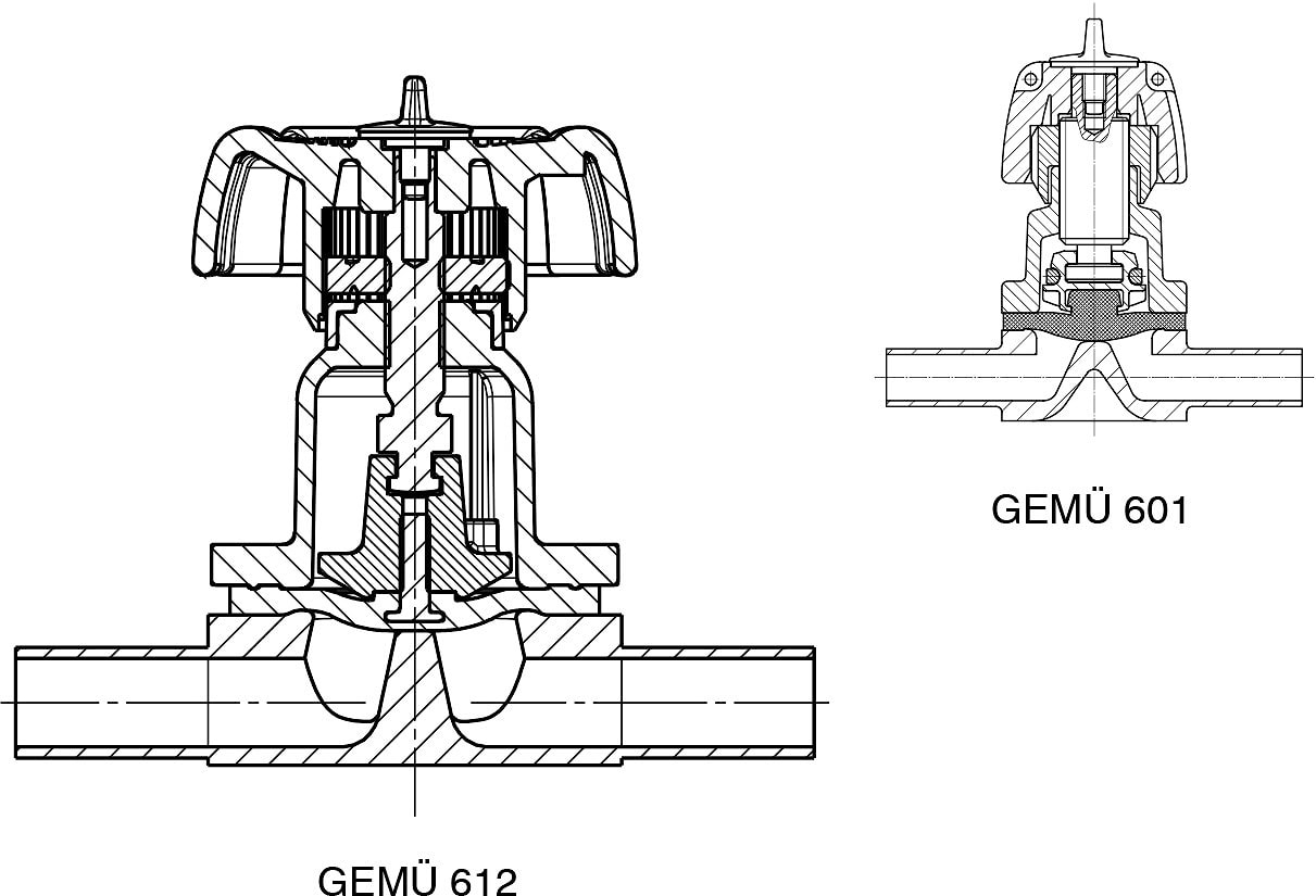Мембранные клапаны GEMÜ 601, 612 и 673 с ручным управлением оснащены маховичком из стойкой к высокой температуре пластмассы, модель GEMÜ 602 - маховичком из нержавеющей стали. Все механические детали и корпус привода выполнены из нержавеющей стали. Серийно устанавливается ограничитель хода клапана для продления срока службы мембраны а также визуальный индикатор положения.