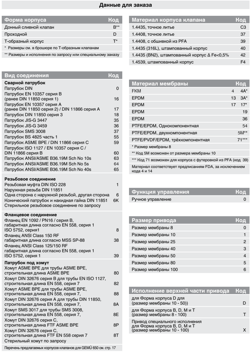 2/2-ходовой мембранный клапан GEMÜ 653 / 654 с ручным управлением в металлическом исполнении имеет корпус привода из нержавеющей стали. Клапан выпускается в двух вариантах: модель GEMU 653 оснащается маховичком из стойкой к высокой температуре и химическим веществам пластмассы, на модели GEMU 654 маховичок из нержавеющей стали. Маховичок не поднимается. Визуальный индикатор положения устанавливается серийно. Корпус привода выпускается в двух вариантах: для проходного корпуса или T-образного клапана, а также как многоходовой корпус.