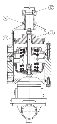 Нижний поршень привода при активации выполняет ход до 100 %. Напротив, ход верхней части привода может быть плавно ограничен ограничителем открывания (поз. 17) в диапазоне от 0 % до 100 % и зафиксирован с помощью контргайки (поз. 16). В случае ограничителя открывания поршень привода (поз. 13) перемещается по направлению к ограничителю открывания (поз. 17) и высвобождает лишь часть потока рабочей среды. Если активируется только нижняя часть привода, то клапан полностью открывается, при этом шпиндель (поз. 27) смещается вверх поршнем привода.