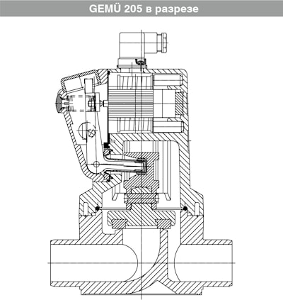 2/2-ходовый электромагнитный клапан GEMÜ 205 с прямым управле-нием в исполнении из пластмассы оснащён мощными приводнымимагнитами. Герметизация магнита осуществляется с помощьюуплотнительной втулки рычага из PTFE (политетрафторэтилена).Уплотнение клапана подвижно. Электрическое подключениеосуществляется через приборную розетку в соответствии сDIN EN 175301-803, форма A. Для подключения переменного токаприборная розетка содержит выпрямитель. В серийную комплекта-цию также входит аварийное ручное управление и визуальный инди-катор положения.